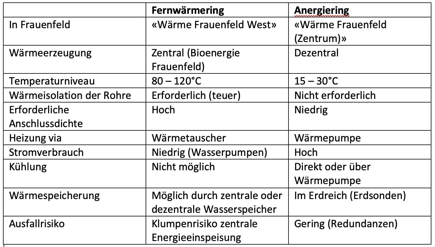 Bei «Wärme Frauenfeld (Zentrum)» handelt es sich jedoch nicht um ein konventionelles Fernwärmenetz, sondern um ein Anergienetz, das auf einem viel tieferen Temperaturniveau (10 – 30°C) basiert. Dessen Leitungen bestehen aus viel preisgünstigeren Plastikrohren, welche nicht isoliert sein müssen und weniger Druck standhalten müssen. Warmwassererzeugung und Gebäudeheizung beim Verbraucher erfolgt über Wasser-Wärmepumpen, welche auch umgekehrt zur Kühlung verwendet werden können.