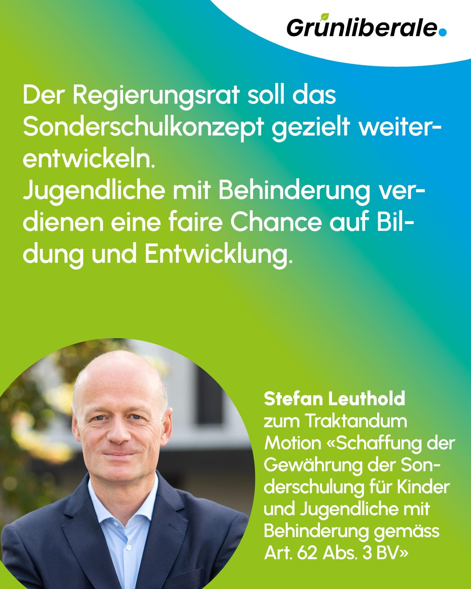 Stefan Leuthold zum Traktandum Motion «Schaffung der Gewährung der Sonderschulung für Kinder und Jugendliche mit Behinderung gemäss Art. 62 Abs. 3 BV».